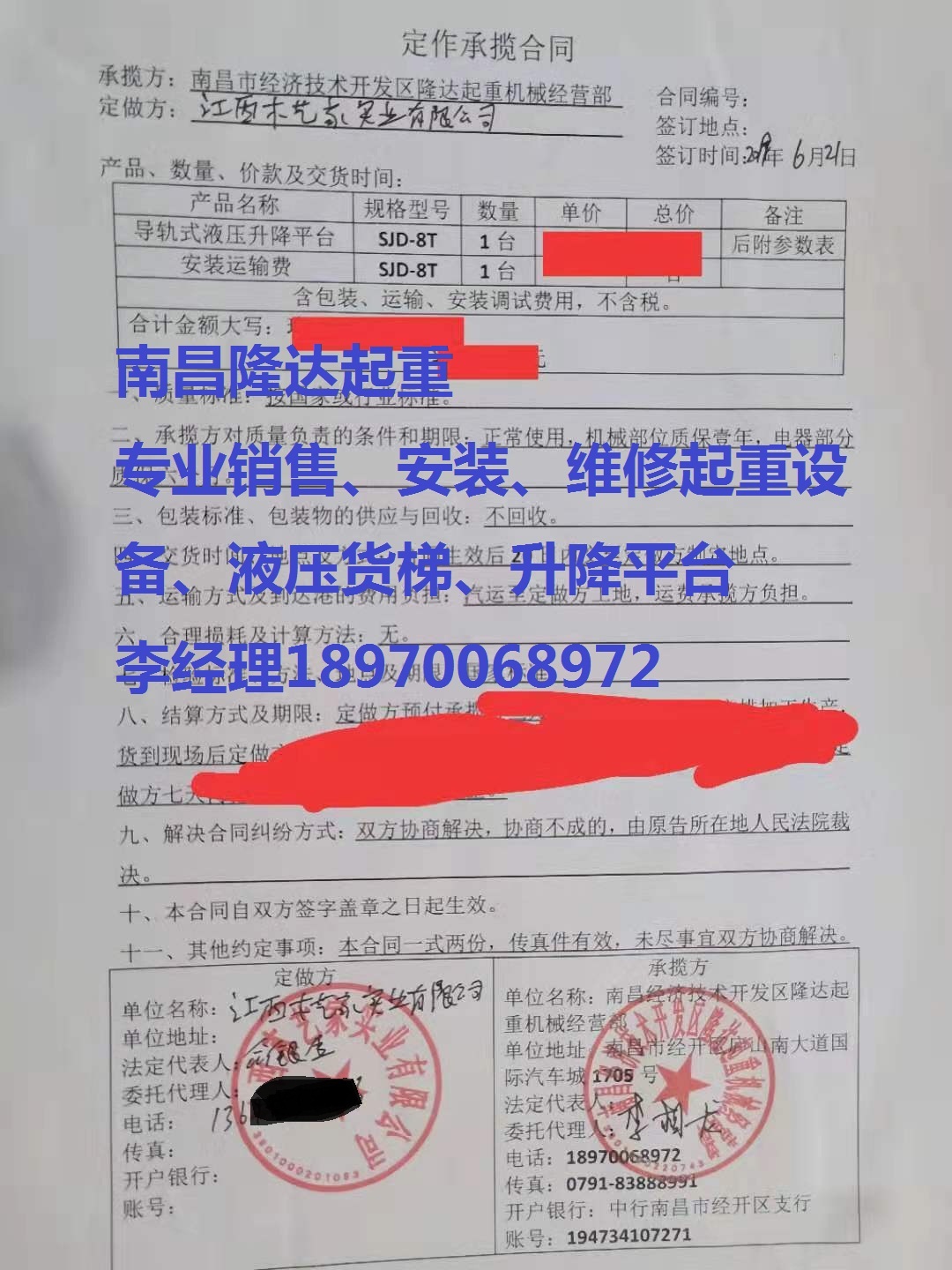 江西木艺家具实业有限公司8T液压货梯安装工程